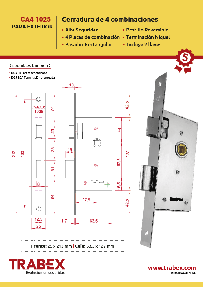 La Cerradura de Seguridad Trabex CA4 1025 para Exterior está diseñada para brindar máxima protección en puertas de ingreso. Equipada con 4 placas de combinación y un pasador rectangular de alta resistencia, ofrece un nivel superior de seguridad frente a intentos de apertura forzada. Su pestillo reversible permite adaptarla fácilmente a puertas derechas o izquierdas, y su terminación níquel garantiza durabilidad y un aspecto moderno.