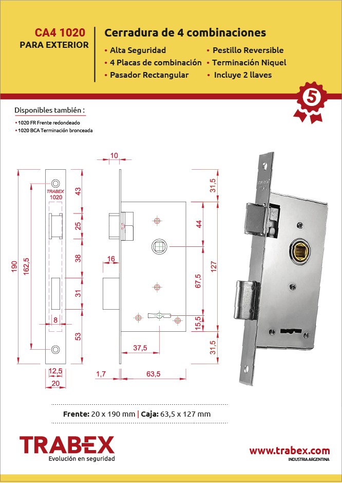 La Cerradura de Seguridad Trabex CA4 1020 para Exterior está diseñada para brindar máxima protección en puertas de ingreso. Equipada con 4 placas de combinación y un pasador rectangular de alta resistencia, ofrece un nivel superior de seguridad frente a intentos de apertura forzada. Su pestillo reversible permite adaptarla fácilmente a puertas derechas o izquierdas, y su terminación níquel garantiza durabilidad y un aspecto moderno.